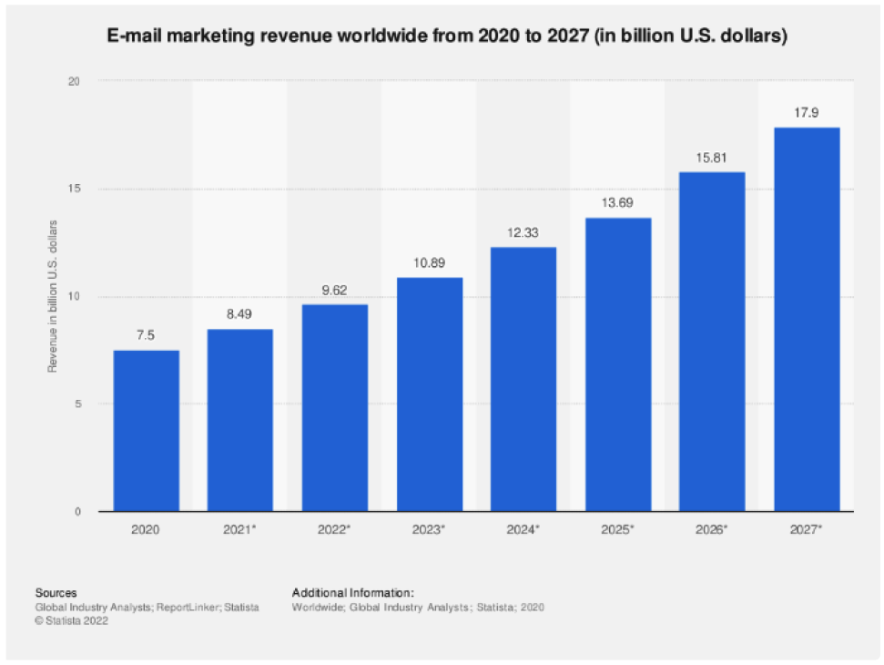 Email marketing revenue worldwide from 2020 to 2027 (forecast).